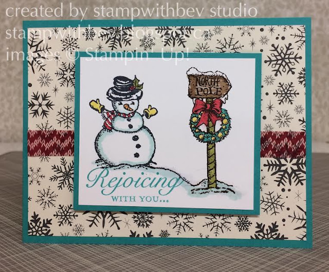 And now, here is another cute little card I made with the Christmas Magic set. I used some alcohol markers to create the snow shadows. And I used a black marker to join the lines between the snowman and the North Pole sign.